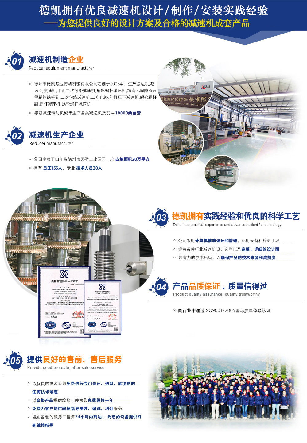 德州市德凱減速傳動機械有限公司,生產(chǎn)減速機,減速器,變速機,平面二次包絡(luò)減速機,蝸輪蝸桿減速機,精密無間隙雙導(dǎo)程蝸輪蝸桿副,二次包絡(luò)減速機,蝸輪蝸桿,軋機壓下減速機,蝸輪蝸桿副,蝸桿減速機,蝸輪蝸桿減速機,公司占地面積20萬平方,員工155人,技術(shù)人員30人,年生產(chǎn)各類減速機及配件18000余臺套。在同行業(yè)中通過了ISO9001質(zhì)量管理體系認(rèn)證。公司設(shè)備齊全、技術(shù)力量強大、檢測手段完善,引進(jìn)國外大型數(shù)控二次包絡(luò)機床GJK75加工數(shù)控4臺,可加工到800二次包絡(luò)蝸輪蝸桿。引進(jìn)漢江S7732蝸桿磨床3臺,精度可達(dá)5級。公司擁有輝光離子氮化爐4臺,經(jīng)該設(shè)備氮化后可提高蝸桿表面硬度、耐磨性高、提高疲勞強度、變形量小、耐蝕性、...